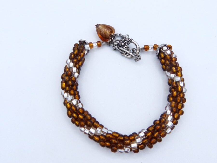 bracelet de perles France est fait de perles de verre brune avec insertion de perles de verre transparentes , fini avec un embout de métal argent et de petites perles brunes et blanches et un petit coeur en verre brun le tout terminé par un fermoir a bascule Ce bracelet est de15 cm de longueur. Il est fait de perles de rocaille.
