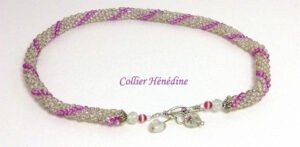 Collier des perles de verre transparent avec insertion de perles rose, le tout avec un fermoir décoratif en forme de coeur qui facilite attachement du collier le tout terminé deux petits coeurs en perles blancs,Longueur 55 cm diamètre 3 1/2 cm