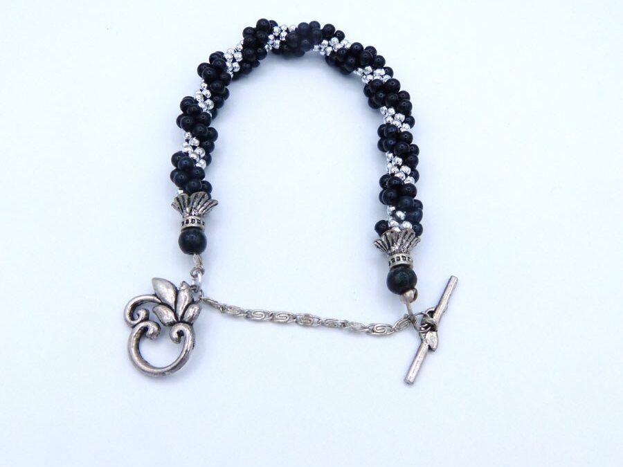 Bracelet de perles argent et de perles noires. Les perles noires sont surélevées et les perles argent sont un peu plus petites, le tout terminé avec un embout en métal argent et une petite perle noire. Ce bracelet se termine par un joli fermoir a bascule et une petite chaîne de sécurité. Il mesure 21 cm.